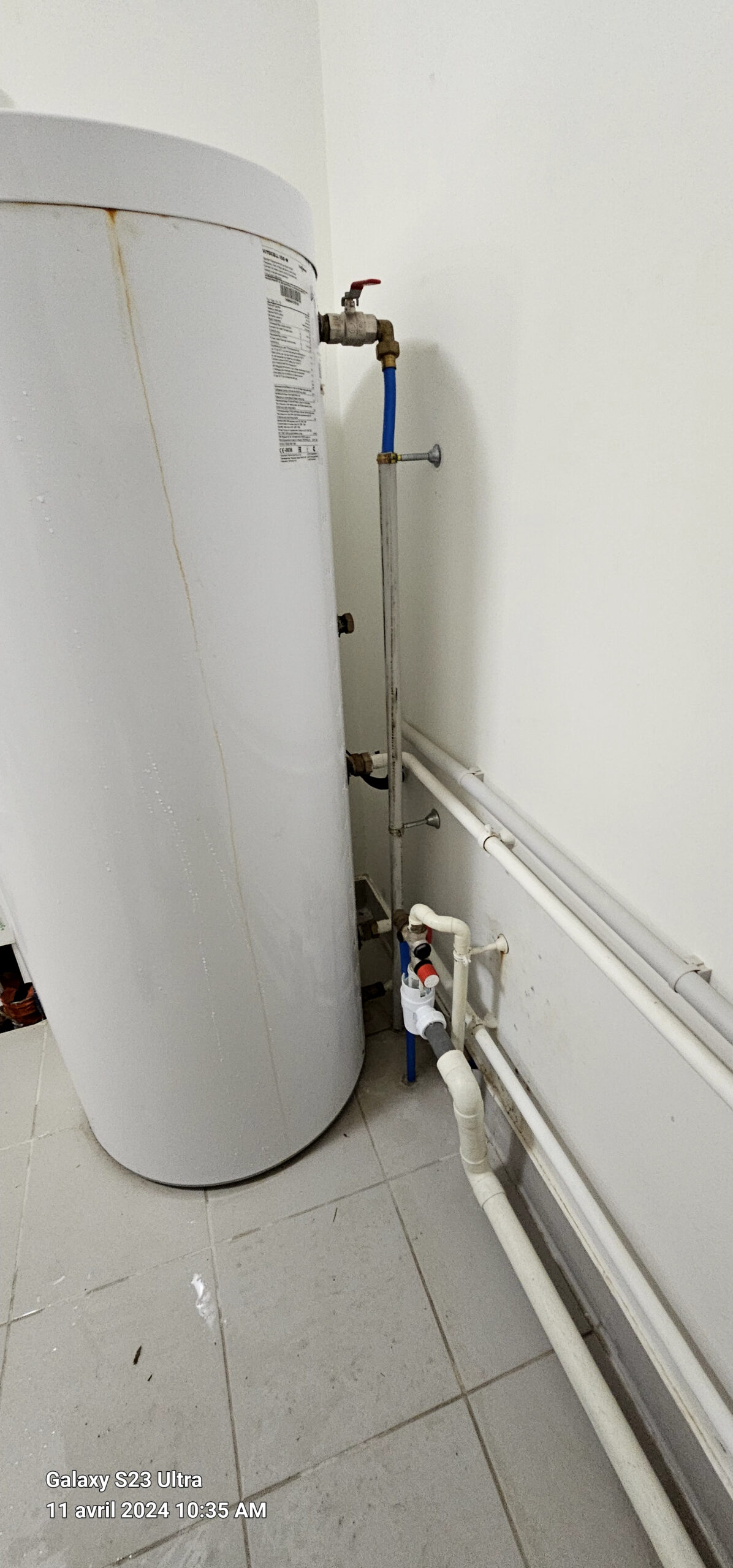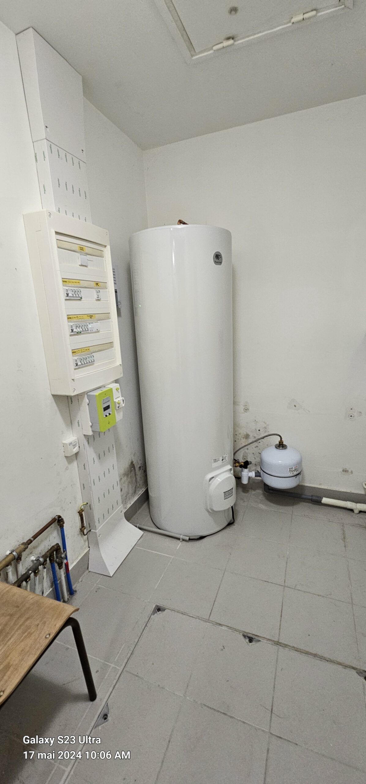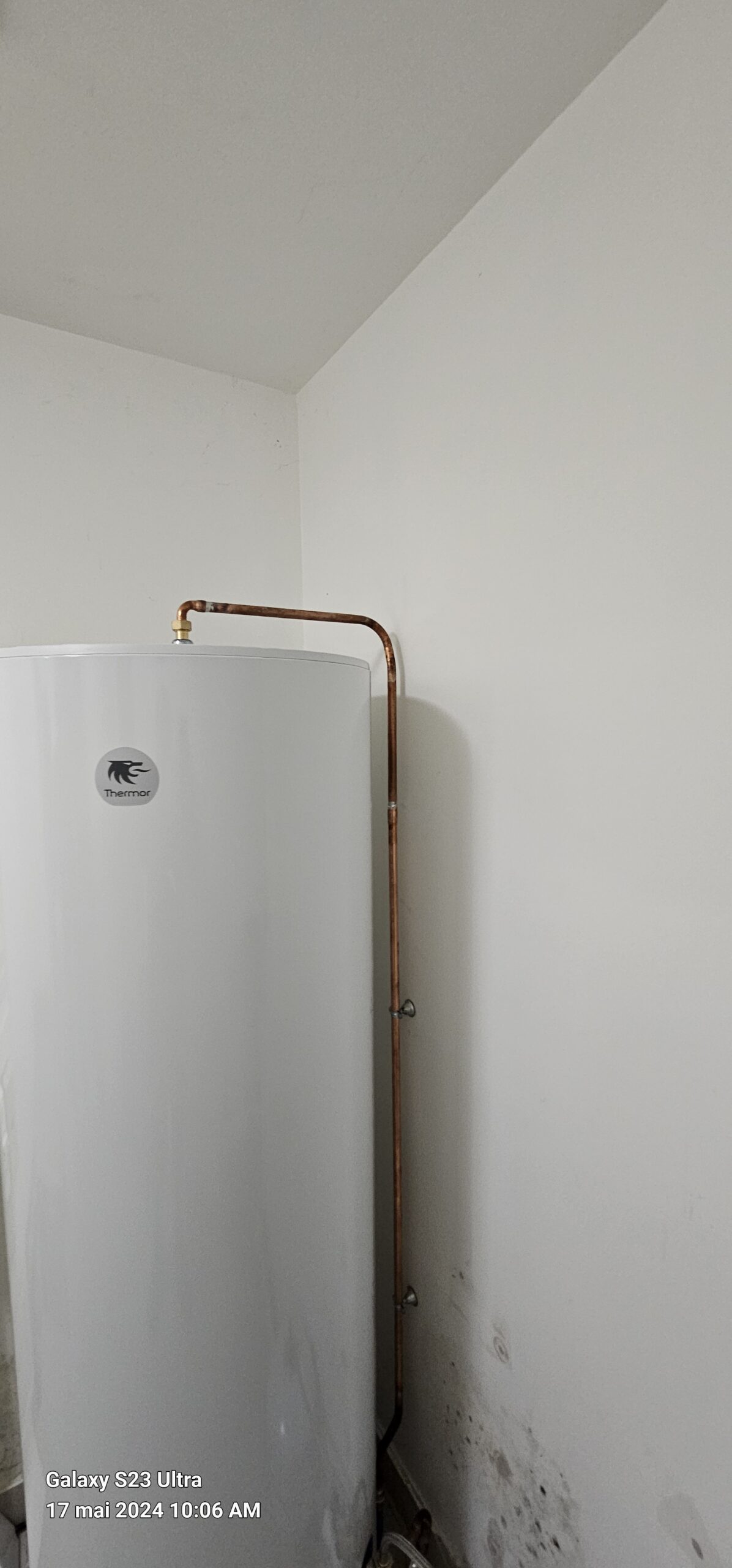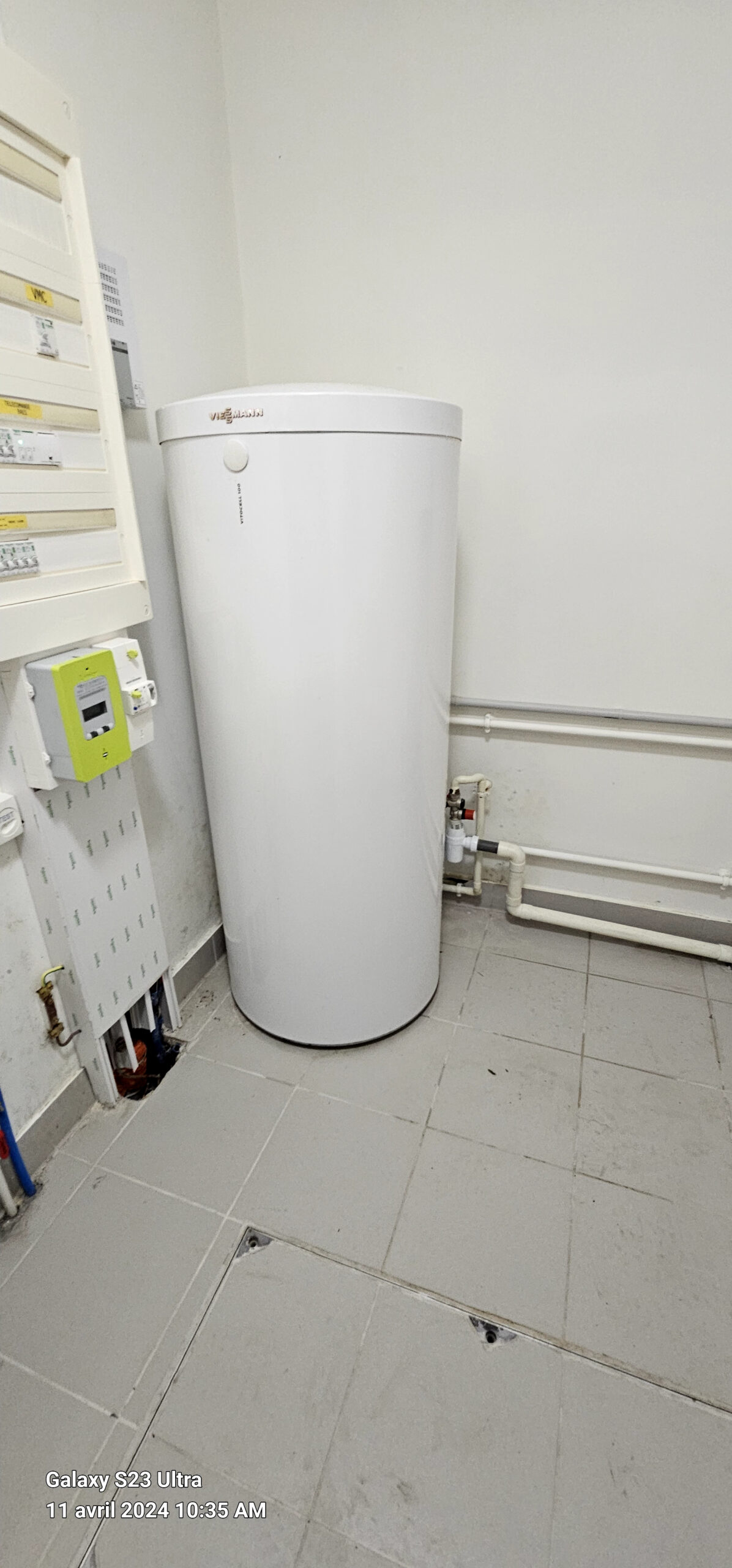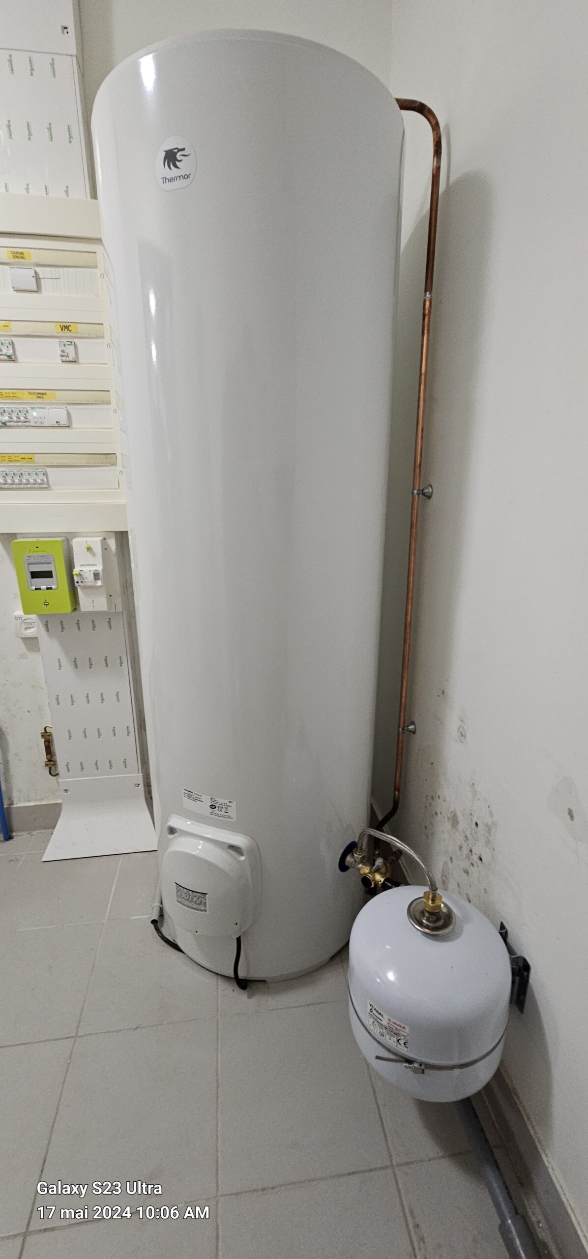 Dépose d’un préparateur d’eau chaude sanitaire Viessmann et pose d’un chauffe eau électrique Thermor de 300l avec son vase d’expansion sanitaire. Raccordement au réseau électrique selon la norme Nfc 15-100.