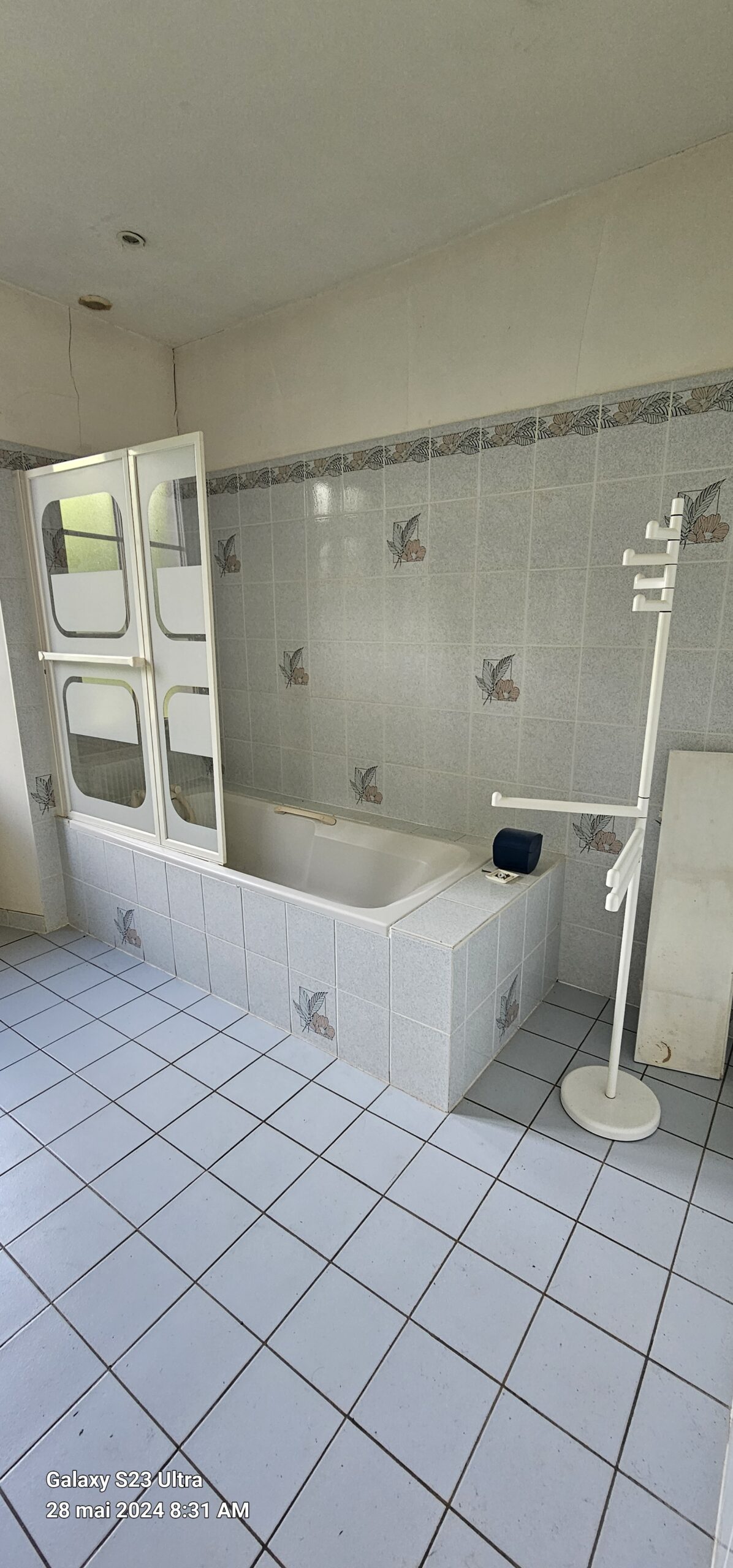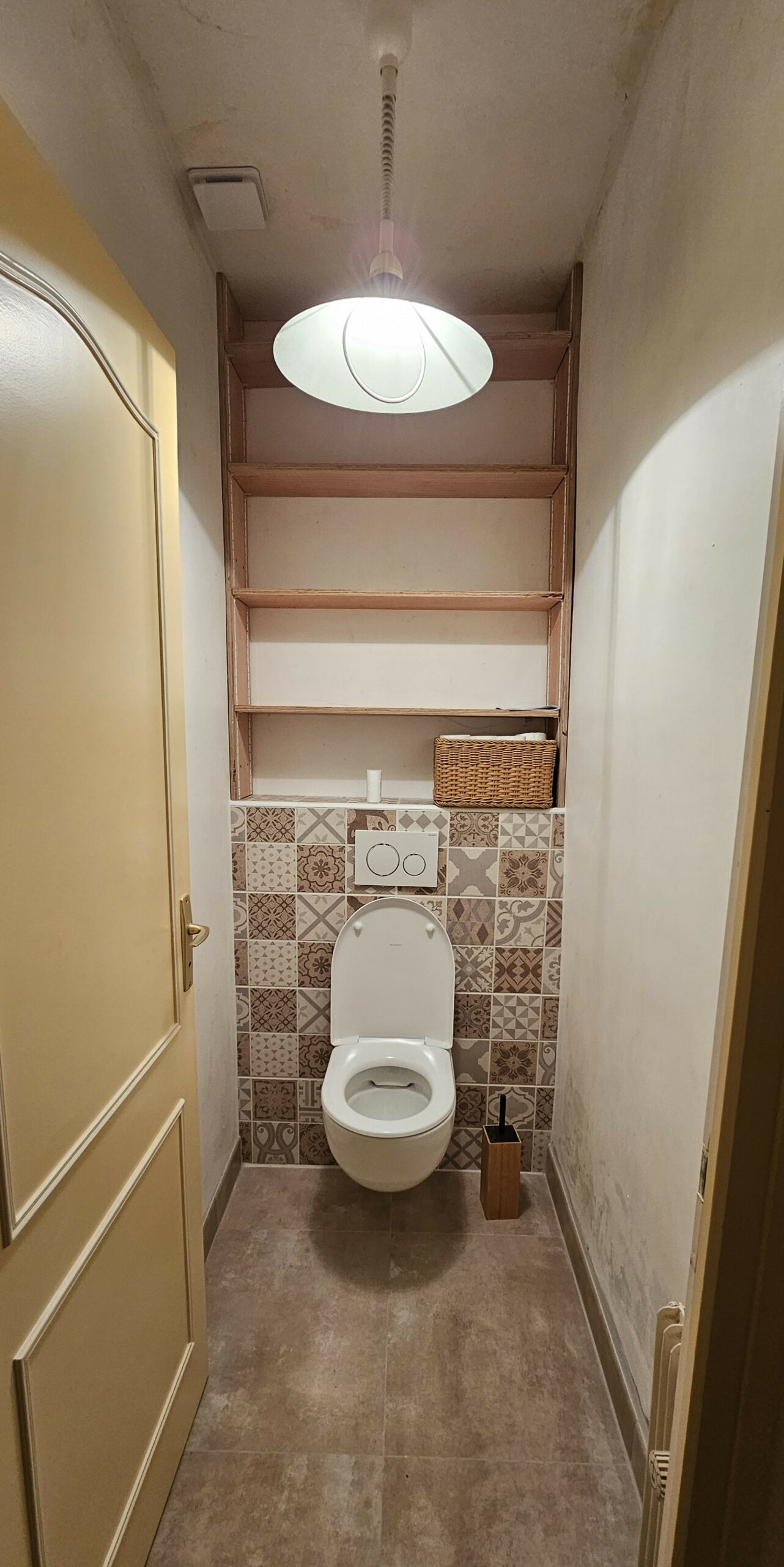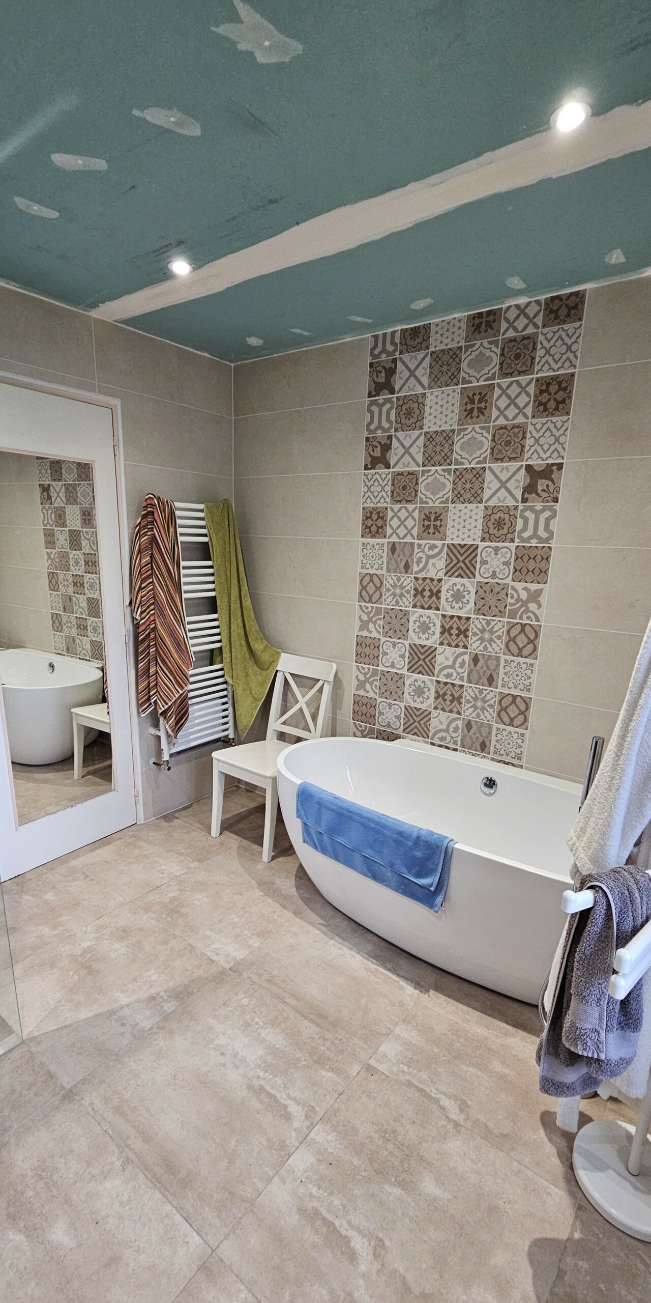 Le carrelage au sol de la salle de bain a été soigneusement posé, suivi de la réalisation des joints. Dans les WC, de la faïence a été posée sur les murs, avec des joints impeccables.