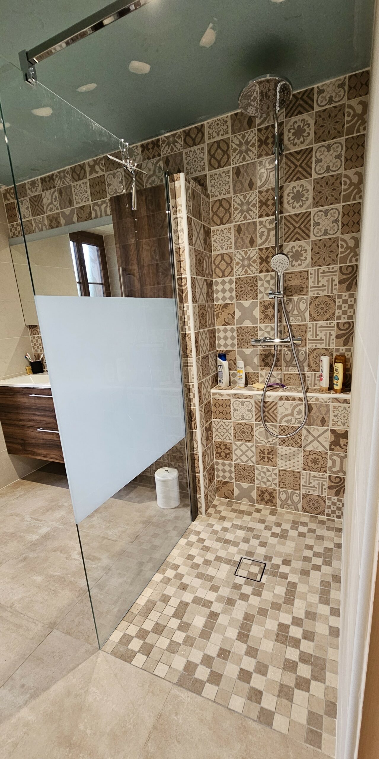 Le sol a été ouvert pour permettre la réalisation d’un bac à douche à l’italienne en béton coulé à la main, offrant un design épuré et un accès de plain-pied. Une couche d’étanchéité spécifique a été appliquée dans la douche pour une protection maximale contre les infiltrations. Ensuite, nous avons posé la faïence murale et le carrelage antidérapant au sol de la douche afin d’assurer sécurité et esthétisme.